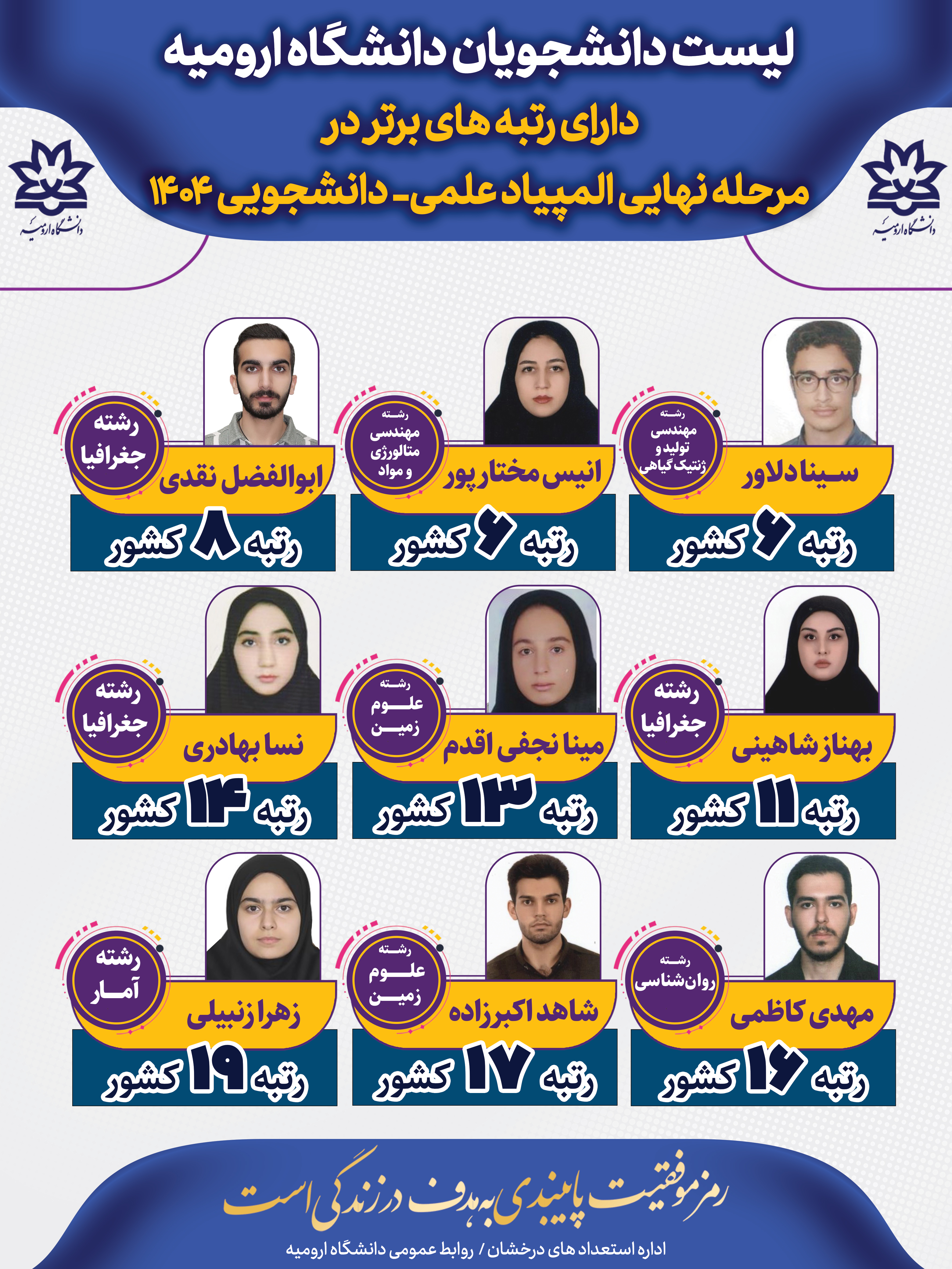 لیست دانشجویان دانشگاه ارومیه دارای رتبه های برتر در مرحله نهایی المپیاد علمی- دانشجویی 1404 به شرح زیر اعلام شد.