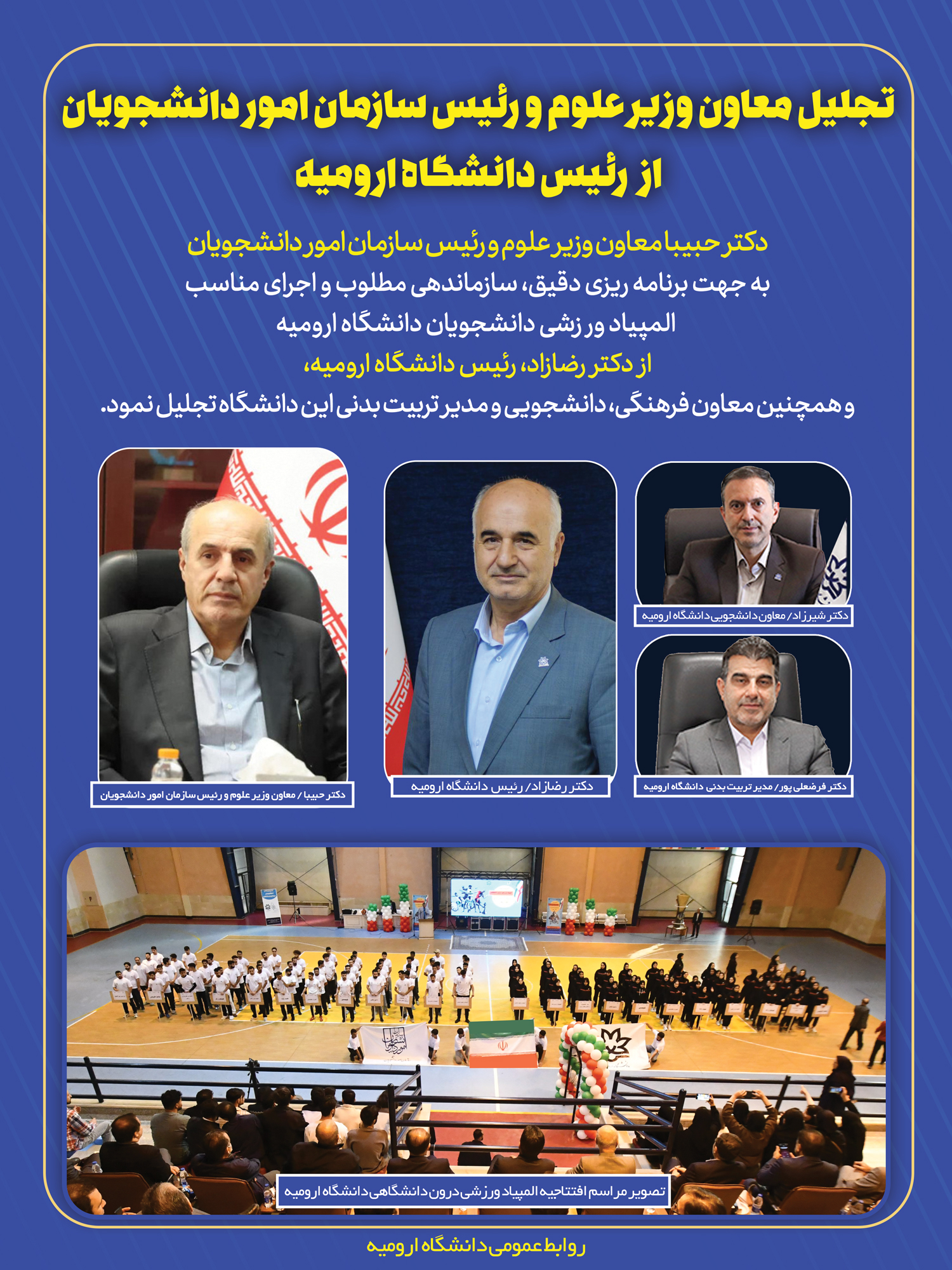 دکتر حبیبا معاون وزیر علوم و رئیس سازمان امور دانشجویان به جهت برنامه ریزی دقیق، سازماندهی مطلوب و اجرای مناسب المپیاد ورزشی دانشجویان دانشگاه ارومیه از دکتر رضازاد، رئیس دانشگاه ارومیه، و همچنین دکتر شیرزاد معاون فرهنگی، دانشجویی و دکتر فرضعلی پور مدیر تربیت بدنی این دانشگاه تجلیل نمود.
