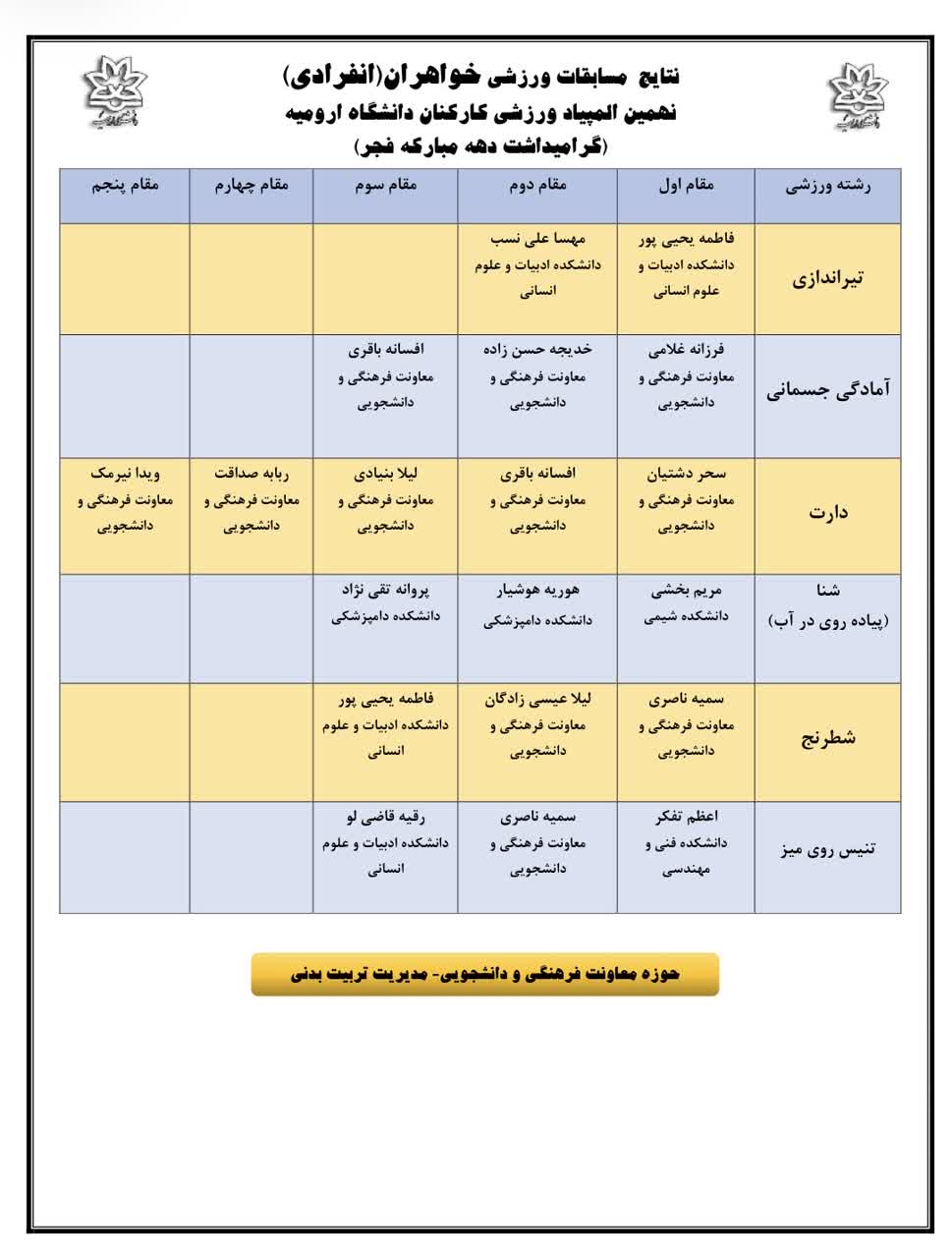 لازم به ذکر است این مسابقات در ۱۰ رشته ورزشی (پیادهروی همگانی، فوتسال، والیبال، بدمینتون، تنیس روی میز، شطرنج، آمادگی جسمانی، شنا، دارت و تیراندازی) در دو بخش خواهران و برادران، از تاریخ ۱۲ بهمن لغایت ۲۶ بهمنماه در اماکن ورزشی دانشگاه ارومیه با حضور بیش از ۵۰۰ نفر از همکاران دانشگاهی برگزار گردید.